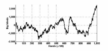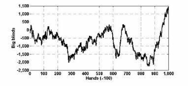 图表变数部分其实就是X轴(不偏向任何一方)。如果我们假设一个标准差为100个大盲/100手牌(对于一名6人桌玩家来说是正常的),那么10万手牌的变数图形走势情况可能如下:
