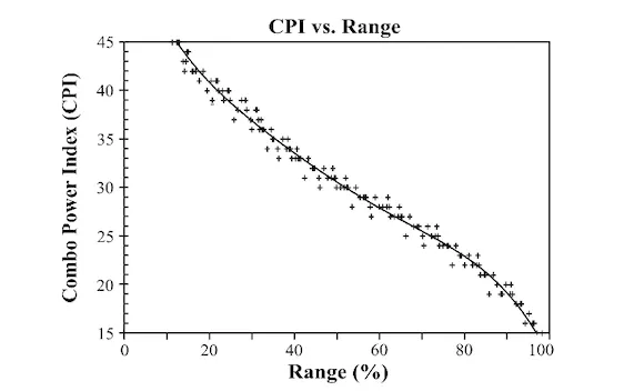 图4.2a,组合牌力指数vs累计范围。曲线是一个最佳解为r2=0.992的六阶多项式。