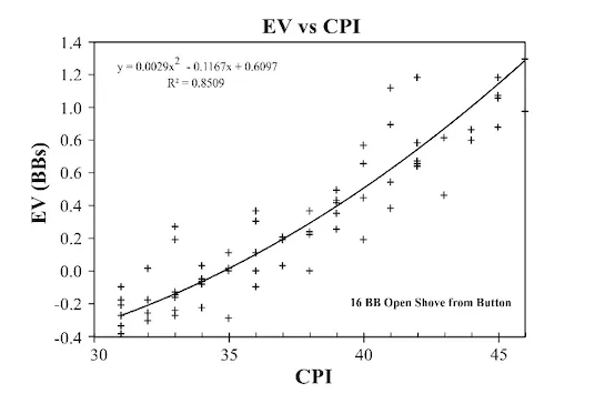 它显示了最前10%到50%所有手牌全压的EV,这是在绝大多数情况下最有利的范围。随后我简单地调整了CPI参数来最大化“适合度”。最后,我进行了一些小的调整来让CPI算法更易于在线下赛事中使用。