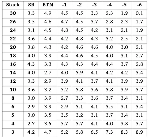 在5-30BB有效筹码量区域内,平均值是3.7个LUSE点。所以与其记忆一个像这样的复杂表格,还不如在我们游戏一场无底注锦标赛的时候简单直接的向我们的殿堂级算法要求中添加4个LUSE点。这会使绝大多数牌况略显保守。
