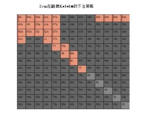 这一场景的范围完全相同,这个场景中枪口位置玩家的平衡策略是在A♠9♥6♠翻牌 中用1/4的范围下注半底池大小。为什么Ivan在K♦8♦8♣ 这个翻牌的下注频率这么高呢?