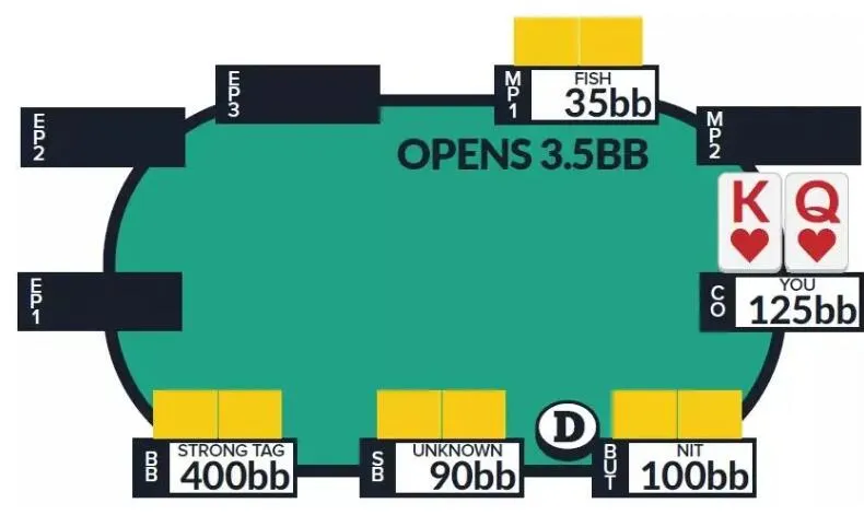 一名鱼玩家在中间位置率先加注,你在按钮位置拿着同花KQ。你朝后面看了看,并记起大盲位置喜欢在翻前做压榨加注。你应该怎么做?