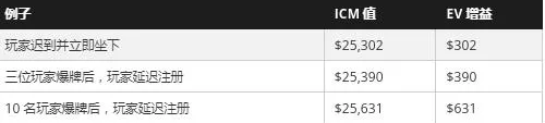 如您所见,在任何情况下,晚注册都能立即获利。但是,如果您可以等待10名玩家出局,利润将增加一倍以上。这只是基于当前正在举行的25,000美元赛事的一个假设示例,如果参赛人数较少,并且玩家能够等待更多淘汰,那么晚注册距离奖金越近,利润就越明显。