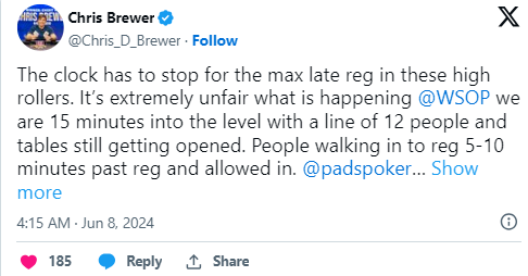 上周,关于延迟注册的话题再次在 WSOP 上引发热议,豪客赛选手Chris Brewer抱怨玩家滥用延迟注册。问题是选手们在最大延迟注册后拖延时间,实质上是试图在开始比赛前争取尽可能多的时间,因为他们的记分牌还没有投入比赛。