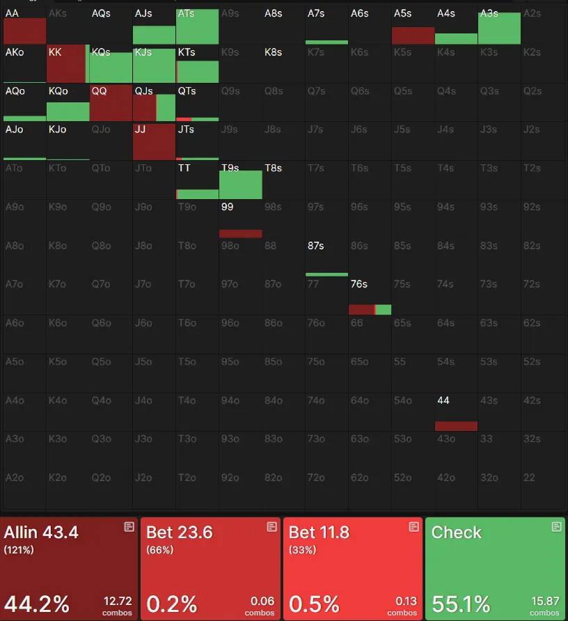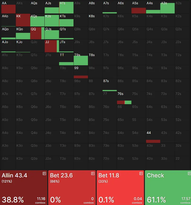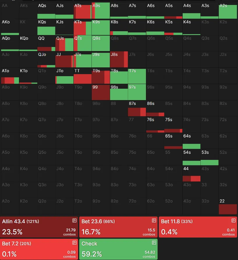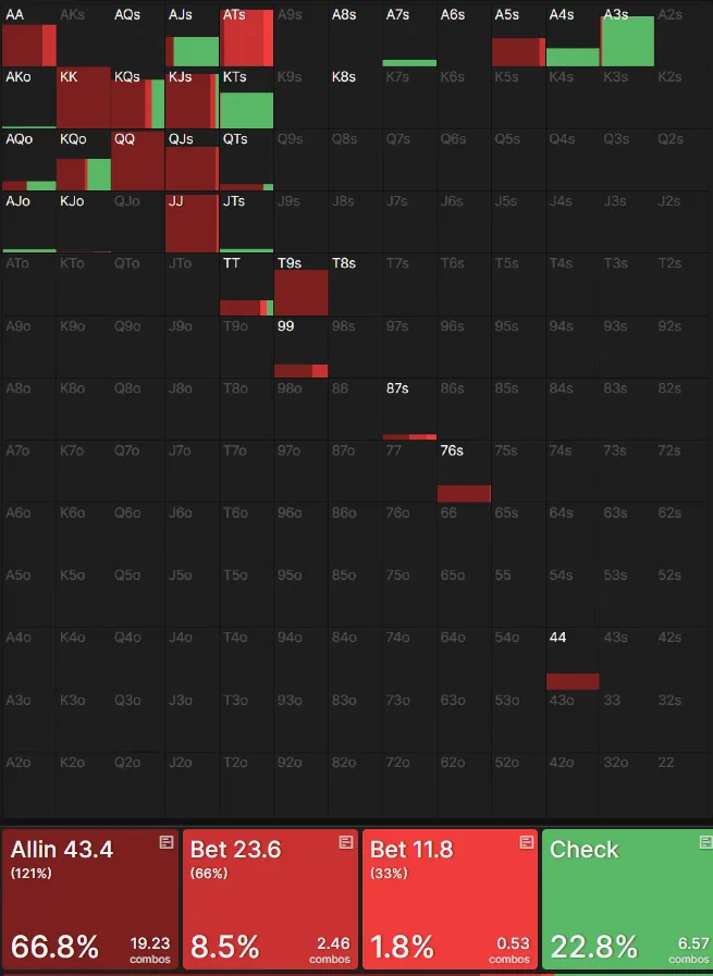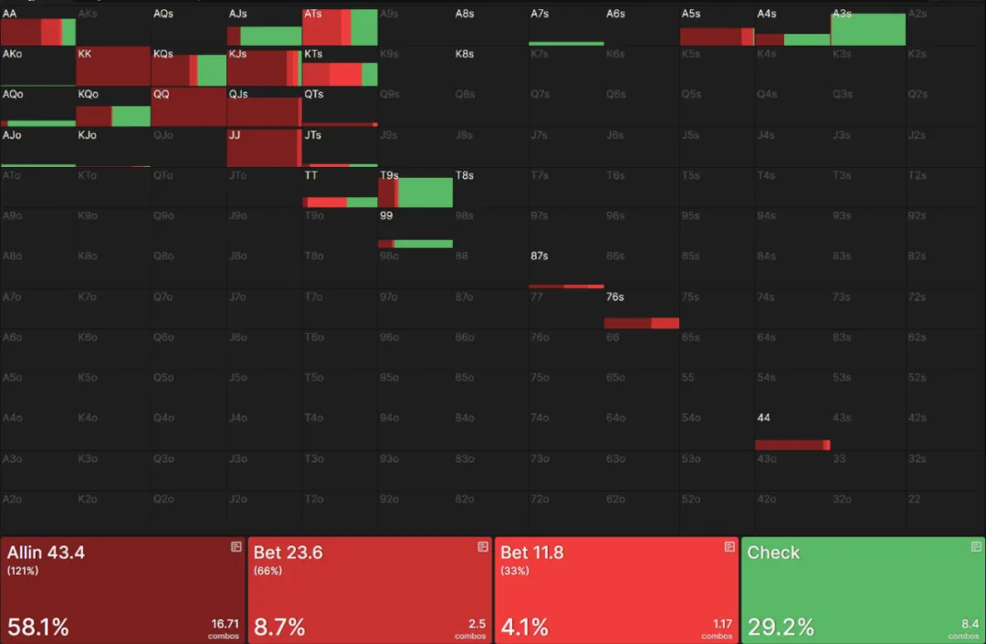 我们在这里下注 70%,所以不会有太多的过牌来诱使对手诈唬。过牌来诱使对手的牌是TT、99、T9、ATs和KTs。所有顶对或更好的牌,而且至关重要的是,它们都阻断了跟注范围。当我们有T9s作为顶对时,BTN很难有一手会跟注的牌。所有高对和set 4都会100% 下注,因为它们可以解除顶对的阻断。