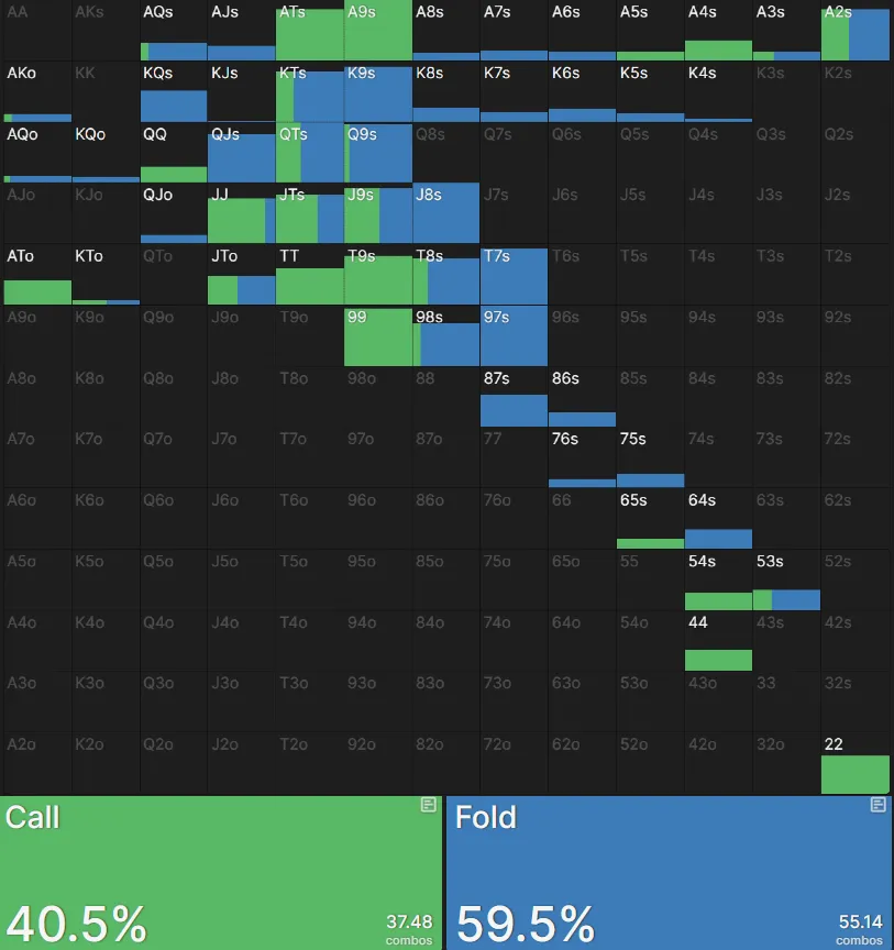 我对此感到很惊讶。我原本以为,如果反派弃牌过多,我们就会全下更多,但实际上我们全下的更少。过牌较多的牌与阻挡跟注范围的价值牌相同,例如 T9s 和 TT。这显然是诱导诈唬的策略。