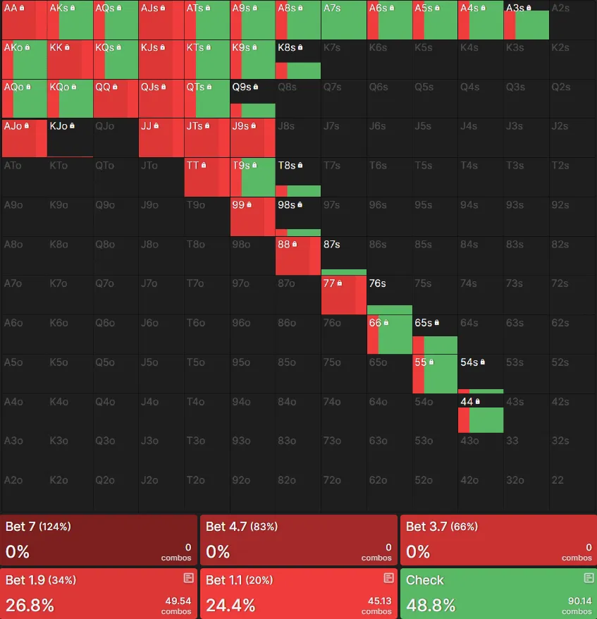 但是,如果我们的对手没有意识到他们应该在这个翻牌圈下注,会怎么样呢?如果我们调整他们的范围,让他们有时用一些不成对的牌和弱对子过牌,但有时他们仍然诈唬,会怎么样呢?我们必须使用 GTO Wizard 中的节点锁定功能,这是我们锁定的响应(我们还从 BB 锁定了 100% 过牌节点):