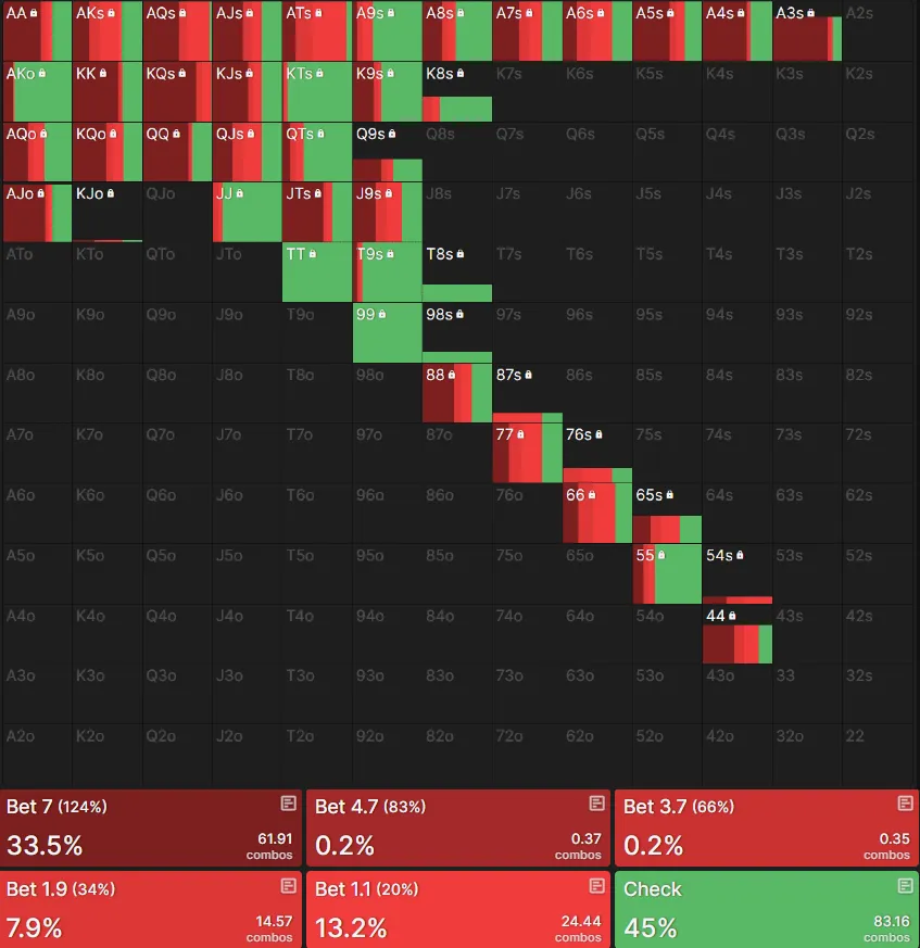 UTG有45%的时间会过牌,但解算器会选择check back一些Set以保护范围,以及一些顶对和底对。