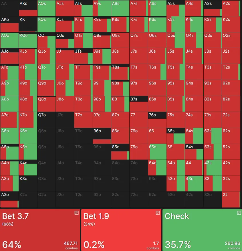 此范围的主要过牌是A- high。因此,我们让UTG过牌翻牌并在转牌上拿一张非同花A。BB的第一反应是再次100% 过牌。UTG非常看重A-x,因此他们有64%的胜率,这是一个巨大的范围优势。我们只是因为一次混乱的过牌/加注而止损。