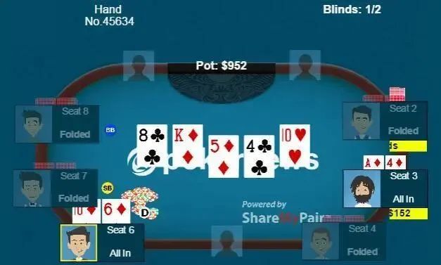 按钮玩家下注32美元后,两个盲注玩家弃牌,中间位置玩家(初始加注者)决定再加注到103.54美元。他还剩下约151美元筹码。这个加注看起来相当强。因此,如果按钮玩家用全压来回应,他按理应该跟注。