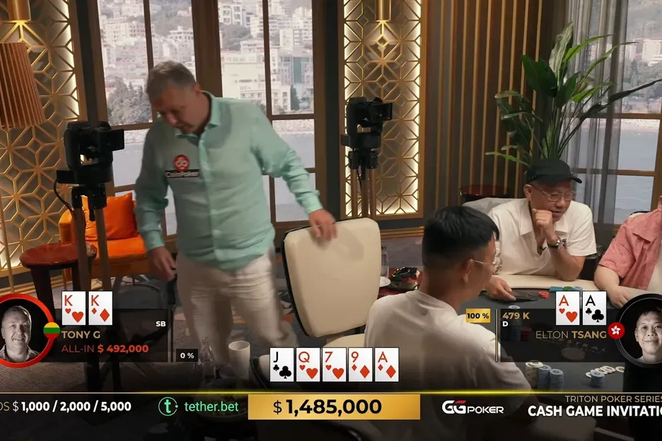 但河牌的A♦确定了Tsang的胜利,在发牌员收牌洗牌之前,Tony G已经起身离场。