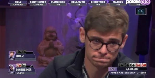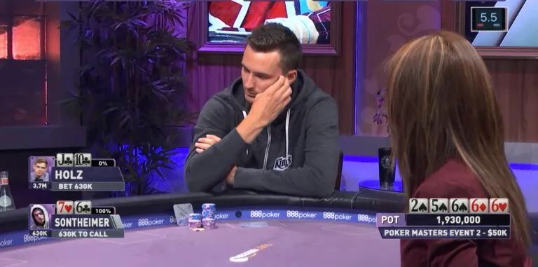 手牌开始时,Holz拥有490万记分牌,而Sontheimer的记分牌则在100万左右。