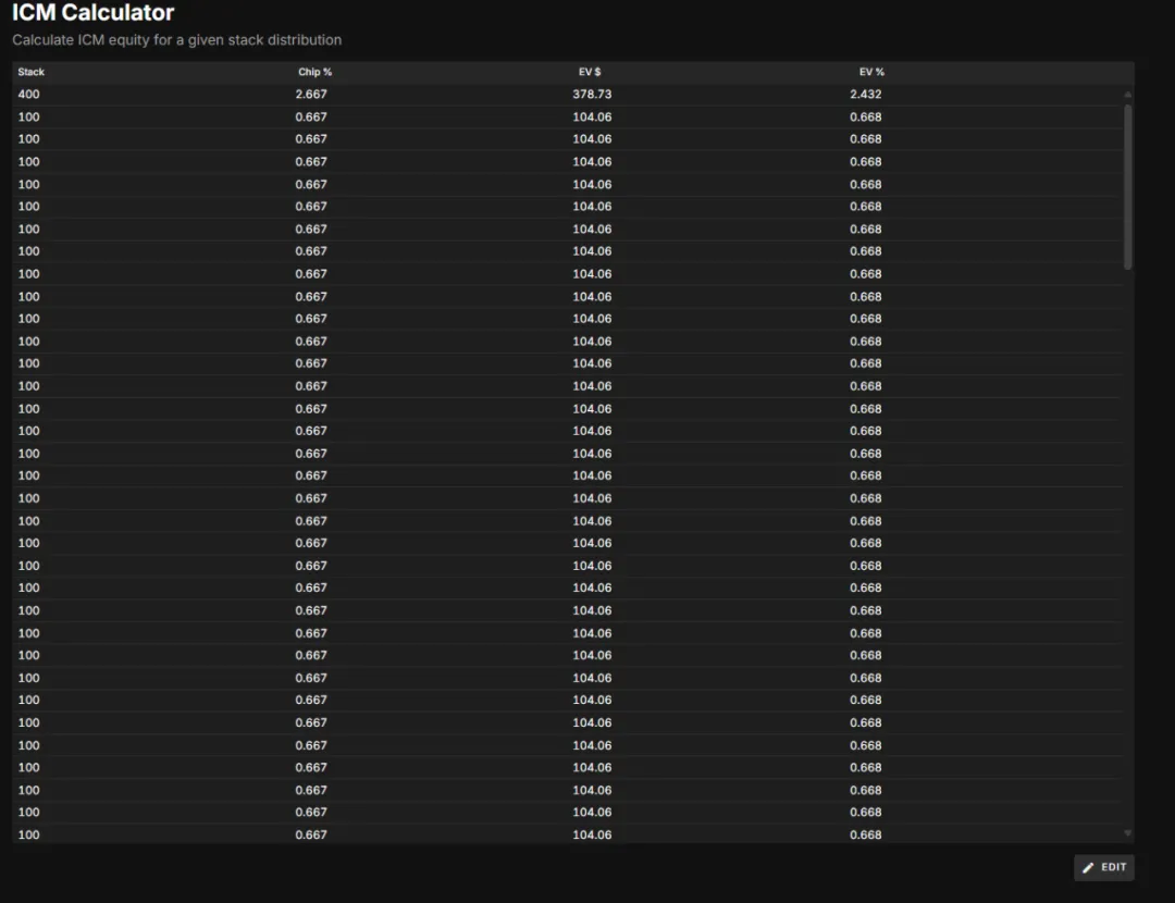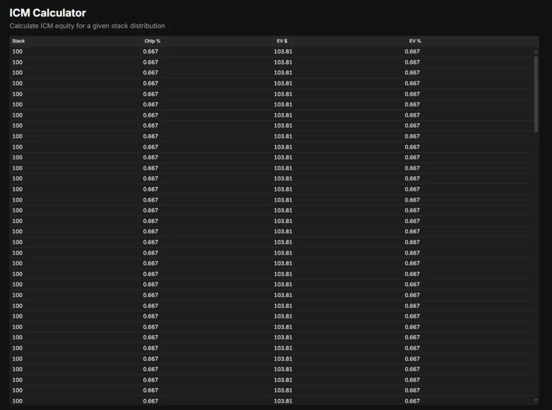 这些是150名玩家参加的109美元MTT开始时的ICM值。并非所有玩家都可见,因为很明显他们的ICM值都相同,即 103.81美元(买入减去佣金)。