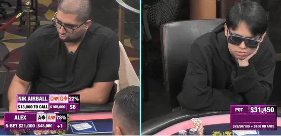 如果Nik Airball跟下来的话,底池有四万四千多,Alex的后手只有四万八,翻牌如果没有A,没有K的话,基本上在转牌就要打光了。