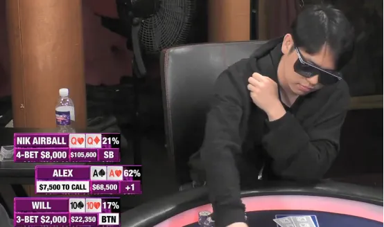 在小盲位拿到Q♥Q♦的Nik Airball面对一个开加和一个3bet,决定进一步加强筹码,4bet到8000。这个动作显示了他对自己手牌的信心,同时也试图控制局面,或是在对手弃牌时抢夺底池。