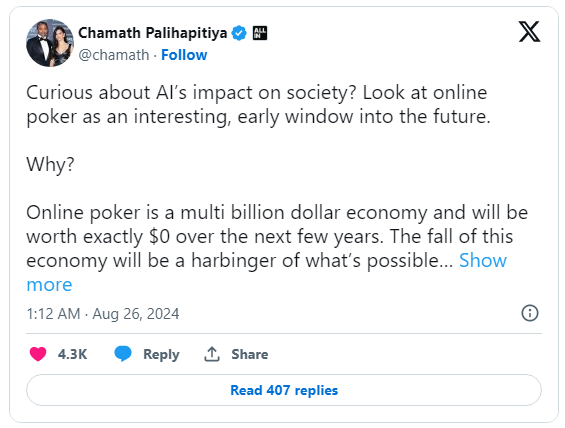 前 Facebook 高管 Chamath Palihapitiya 发布了一条非常有争议性的推文,他声称在线扑克将成为人工智能发展的牺牲品。