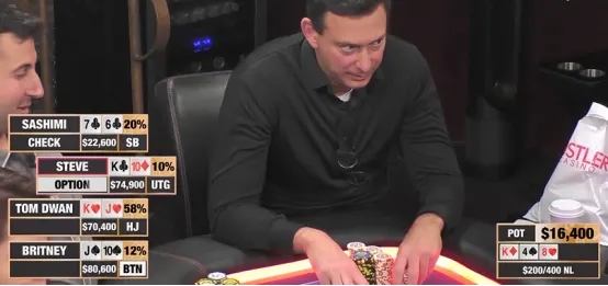 Steve再打四百刀,然后Tom Dwan选择了call。
